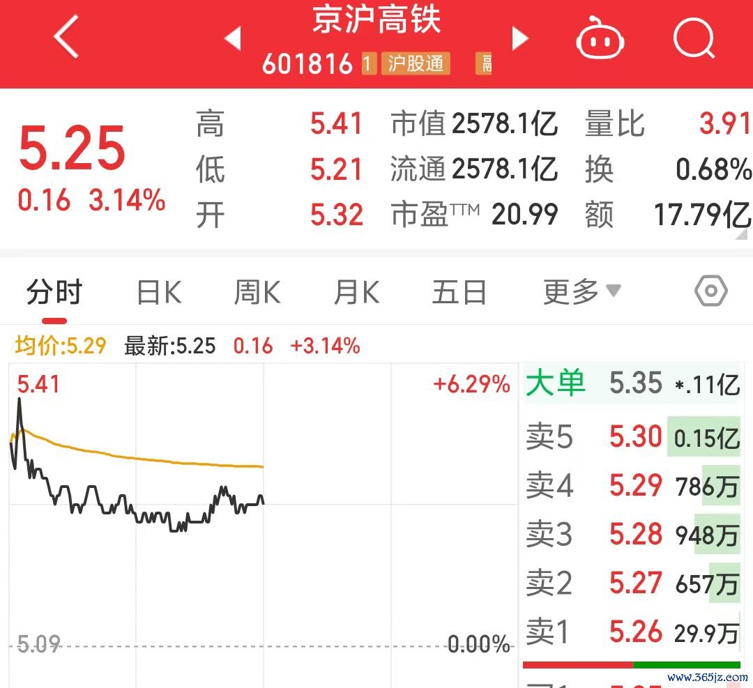 5月6日,京沪高铁(601816.SH)开盘高开高走,一度涨超6%,早盘收盘,涨3.14%,报5.28元,总市值2578.1亿元。铁路运输板块走势强劲,广深铁路涨停,铁路物流涨超4%。